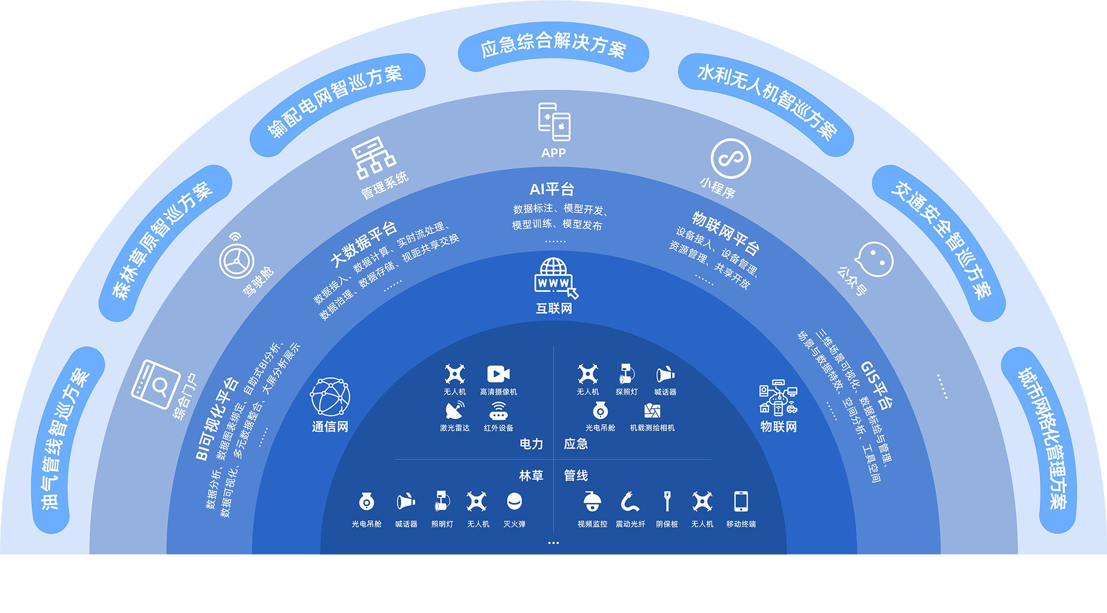 天玑数聚无人机云平台由我公司自主研发,采用微服务框架搭建,融合物联网、人工智能、大数据、3S等关键技术,解决多协议、多网络、多平台、多地域物联设备的接入、管理及监控,通过统一时空框架模型,实现基础数据、空间数据、业务数据等海量异构数据的深度融合和智能处理,形成全空间覆盖、全周期管控、全业务协同的三维数字底盘,满足不同行业的智能化建设需求,为油气管线、森林草原、输配电网、应急管控等应用领域提供基础支撑。