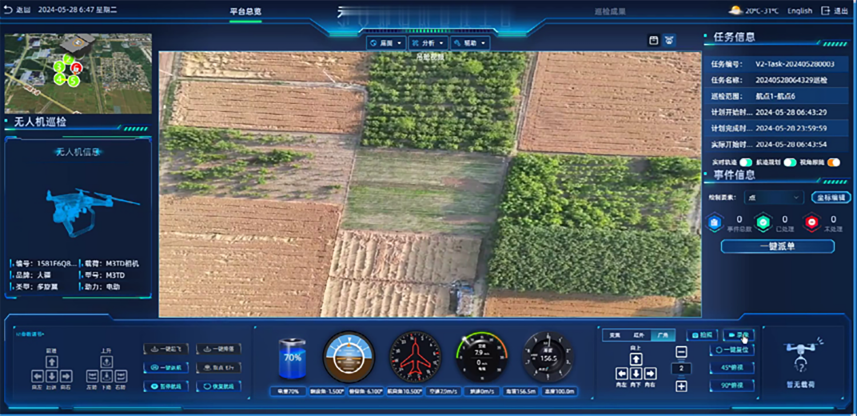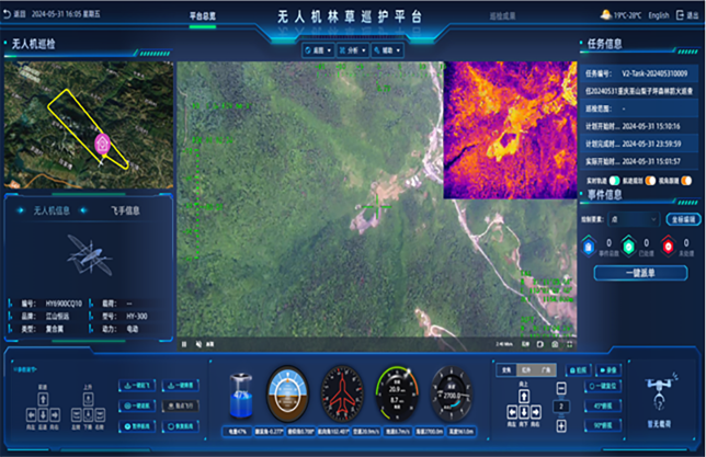 支持实时显示无人机类型、状态、经纬度、高度、姿态、速度、油/电量、时间、飞手、巡护范围等信息
